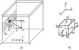 В жидкости, заполняющей какой-то резервуар, выделим элементарный кубик с очень малыми сторонами Δ x, Δ y, Δ z (рис.2.1, б). На каждую из боковых поверхностей будет давить сила гидростатического давления, равная произведению соответствующего давления Px, Py, Pz на элементарные площади. Обозначим вектора давлений, действующие в положительном направлении (согласно указанным координатам) как P'x, P'y, P'z, а вектора давлений, действующие в обратном направлении соответственно P''x, P''y, P''z. Поскольку кубик находится в равновесии, то можно записать равенства