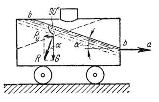 Так как свободная поверхность, как поверхность равного давления, должна быть нормальна к указанной равнодействующей, то она в данном случае представит собой уже не горизонтальную плоскость, а наклонную, составляющую угол α с горизонтом. Учитывая, что величина этого угла зависит только от ускорений, приходим к выводу, что положение свободной поверхности не будет зависеть от рода находящейся в цистерне жидкости. Любая другая поверхность уровня в жидкости также будет плоскостью, наклоненной к горизонту под углом α. Если бы движение цистерны было не равноускоренным, а равнозамедленным, направление ускорения изменилось бы на обратное, и наклон свободной поверхности обратился бы в другую сторону (см. рис.2.6, пунктир).