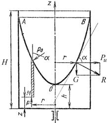 Поверхность жидкости также должна быть нормальна в каждой точке к равнодействующей этих сил R и представит собой параболоид вращения. Из чертежа находим