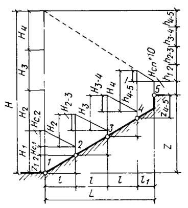 Рисунок 8.5 – Расчетная схема для определения числа насосов, работающих в перекачку: 1, 2, 3. 4, 5 — насосы