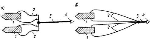 а — по общей магистральной линии; б — по самостоятельным рукавным линиям: 1 — насос, 2 — рабочая рукавная линия, 3 — магистральный рукав, 4 — лафетный ствол