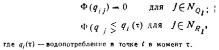 При рассмотрении сложного вероятностного процесса отбора воды для тушения пожаров важно установить оптимальную норму водообеспечения потребителя или отвечающий ей размер риска ε. Значение ε изменяется в пределах доверительного интервала, тем большего, чем менее точен прогноз капитальных затрат, издержек эксплуатации и возмещения ущербов от пожаров. Кроме того, значение ε меняется со временем. Состояние, характеризующее нарушение расчетною водообеспечения конкретного потребителя, может быть представлено следующим образом. Пусть система водоснабжения обеспечивает потребителей водой в соответствии с заданными графиками режима потребления воды по часам суток, дням недели и сезонам года и находится в N различных состояниях. Множество состояний N разобьем на два подмножества Подмножество NRi — совокупность состояний, в которых потребитель i имеет связь хотя бы с одним источником системы (система связана в данном состоянии), а подмножество NQi —совокупность состояний, в которой таких связей нет (система не связана). Состоянию системы в точке i соответствует определенная водоотдача Ф(qij). характеризующая в данной точке качество бесперебойного водообеспечения, которое зависит от пропускной способности элементов изменения напора воды в водопроводной сети и подачи водоисточника в данном состоянии. В некоторых случаях на качество бесперебойного водообеспечения значительно влияет процесс водопотребления более ответственными потребителями системы, чем потребитель i.
