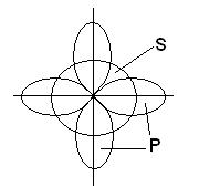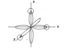 р – электронные облака атома фосфора ориентированы во взаимноперпендикулярных направлениях (вдоль осей координат) –рх, ру, рz и имеют гантелевидную форму. У атома водорода в образовании химической связи Р-Н участвует s-электрон, имеющий сферическую форму облака. При образовании молекулы РН3 происходит перекрывание р - электронных облаков атома фосфора с s-электронными облаками трех атомов водорода: