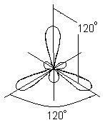 В этом случае вместо исходных одной s- и двух p-орбиталей возбужденного атома бора образуется три равноценные гибридные орбитали (sp2 – гибридизация). При sp2 гибридизации гибридные электронные облака располагаются в направлениях, лежащих в одной плоскости и ориентированных под углами 120° друг к другу: