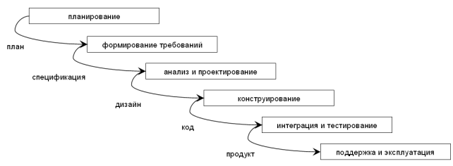 Данная модель предполагает строго последовательное (во времени) и однократное выполнение всех фаз проекта с жестким (детальным) предварительным планированием в контексте предопределенных или однажды и целиком определенных требований к программной системе.