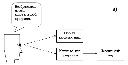 В чем заключаются негативные моменты ситуации, существовавшей до появления языка UML? Как видно из Рис.3.1а объединение текста программы (ее исходного кода) с характеристиками объекта автоматизации осуществляется только в сознании программиста, а документальная связь между ними отсутствует.