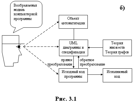 Рисунок позволяет понять причины революционных перемен в области технологий программирования, вызванных появлением языка UML. На нем изображены две схемы. Первая из них (Рис.3.1а) изображает ситуацию, существовавшую в области технологий программирования до создания языка UML, вторая (Рис.3.1б) - показывает изменение ситуации после появления UML. На обеих схемах слева показаны программисты и воображаемые ими модели компьютерных программ, а справа изображены коды программ и предметные области, в которых эти программы используются. На второй схеме между предметными областями и программными кодами появились диаграммы языка UML и их математическая основа – теории множеств и графов.