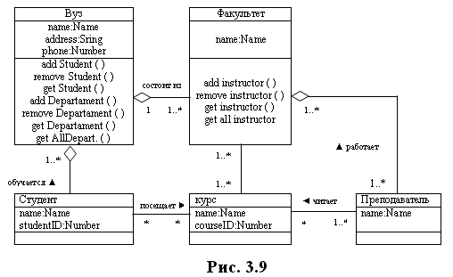Диаграммы классов применяются для моделирования объектно-ориентированных систем. На простых диаграммах показываются классы и отношения между классами. На сложных диаграммах показываются классы, интерфейсы, кооперации и отношения между ними. Диаграммы классов дают статический вид системы. Можно также сказать, что диаграммы классов представляют собой взгляды разработчиков на статические состояния проектируемых систем. С помощью диаграмм классов составляется словарь системы. Диаграммы классов являются основой для создания диаграмм компонентов и развертывания. Следует особо подчеркнуть, что диаграммы классов важны не только для визуализации, специфицирования и документирования структурных моделей, но также для прямого и обратного проектирования исполняемых кодов систем. На Рис.3.9 приведен пример простой диаграммы классов, моделирующей объекты системы регистрации курсов и отношения между ними.