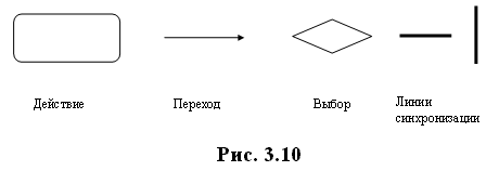 В языке UML действие изображается в виде прямоугольника с закругленными углами, переходы - в виде направленных стрелок, элементы выбора - в виде ромбов, линии синхронизации - в виде горизонтальных и вертикальных линий (Рис.3.10).