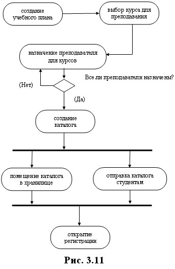 На Рис.3.11 приведен пример диаграммы действий моделирующей действия, выполняемые в процессе создания системы регистрации учебных курсов.