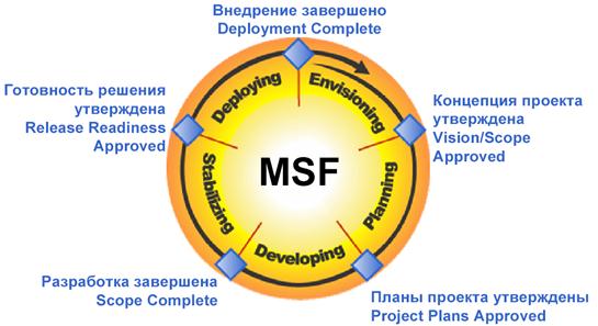 Модель MSF покрывает процесс создания решения с самого его начала и до момента окончательного внедрения. Весь процесс создания решения разбит на пять фаз. Каждая из них заканчивается главной вехой, результаты которой становятся видимыми за пределами проектной команды.