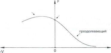 На рис. 7 приведен график зависимости силы тяги мышцы от скорости изменения ее длины при разных режимах мышечного сокращения. Видно, что наибольшую силу тяги мышца проявляет при уступающем режиме сокращения.