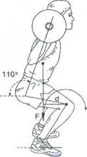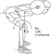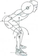 Так, в первой позе туловище сильно наклонено вперед, и как следствие этого результирующий момент силы мышц в коленных суставах направлен на их сгибание, т. е. нагружаются мышцы задней поверхности бедра. И наоборот, при небольшом наклоне туловища вперед основная нагрузка ложится на мышцы - разгибатели коленных суставов. Причина в том, что величина и направление момента силы в суставе зависит от момента силы тяжести звеньев тела и штанги, действующих на данный сустав. Несмотря на то, что в рассматриваемом примере суммарная сила тяжести звеньев тела и снаряда не изменяется, плечо этой силы зависит от положения туловища и бедер. Эта сила приложена в общем центре масс всех звеньев тела, которые расположены выше коленных суставов, и штанги. Таким образом, нагрузку можно регулировать не только массой снаряда, но и плечом внешне действующей силы.