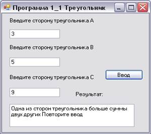 textBox4.Text = "Одна из сторон треугольника больше суммы двух других Повторите ввод ";