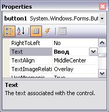 В процессе визуального программирования необходимо изменять некоторые свойства элементов управления, например, у меток и кнопки было изменено свойство Text в соответствии с рисунком 1.3. Для этого необходимо пользоваться окном Properties, которое изображено на рисунке 1.4.