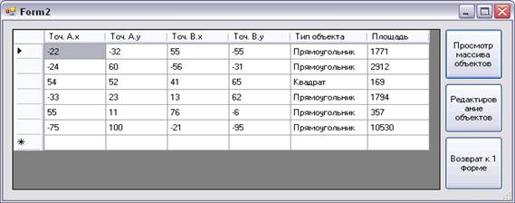 Если в результате редактирования элементов DataGridView изменяется тип прямоугольника, например, получается квадрат, то это учитывается в столбце 4 массива. Одновременно перезаписывается новое значение площади нового прямоугольника.