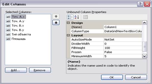 В свойствах элемента DataGridView выбираем Columns и запускаем редактор параметров столбцов таблицы, в котором мы добавляем необходимое количество столбцов и определяем название столбцов в окне формы и имя столбцов в программе (см. рисунок 6.7). С помощью редактора столбцов определяется их ширина в окне формы.