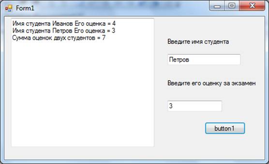 if (n == 2) textBox1.AppendText("Сумма оценок двух студентов = " + (styd[0] + styd[1]).ToString() + "\r\n");