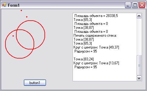 Печать содержимого элементов стека является примером полиморфизма (динамического наследования методов). Действительно, «статически» печать элемента стека рассчитана на печать элемента простейшей геометрической фигуры. Но в процессе работы программы (в этом суть динамического наследования методов) в стек помещаются объекты классов точка и круг.