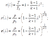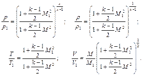 Указанные уравнения связывают параметры газа в одном и том же сечении потока и справедливы независимо от характера течения и происходящих в газе процессов. Переход от параметров в потоке к параметрам заторможенного газа по определению происходит по идеальной адиабате.