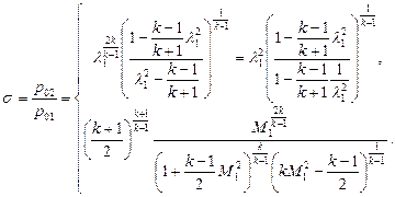 , называемая коэффициентом восстановления полного давления, характеризует собой необратимые потери механической энергии на скачке (1 – параметр до скачка, 2 – после скачка). Ее определяют по формуле
