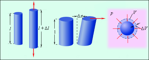 | Рисунок 3.7.1. Некоторые виды деформаций твердых тел: 1 – деформация растяжения; 2 – деформация сдвига; 3 – деформация всестороннего сжатия.