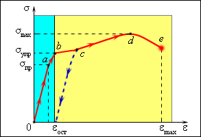 | Рисунок 3.7.2. Типичная диаграмма растяжения для пластичного материала. Голубая полоса – область упругих деформаций.
