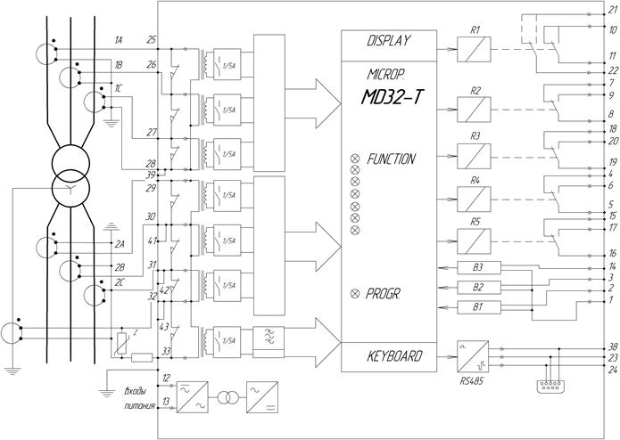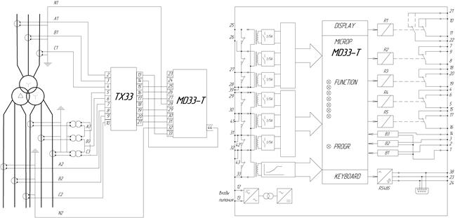 Рис. 7. Схема диференційного захисту двообмоточного трансформатора з використанням реле MD32-Т.