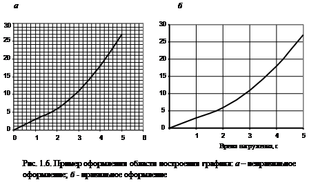 Оси координат в прямоугольной системе координат вычерчивают сплошными основными линиями. Стрелки на концах осей ставить не следует (рис. 1.6). Шкалы на осях следует выбирать из условия максимального использования всей площади графика. Через деления шкал сплошными тонкими линиями проводят координатную сетку (расстояние между соседними линиями сетки должно быть не менее 5 мм).