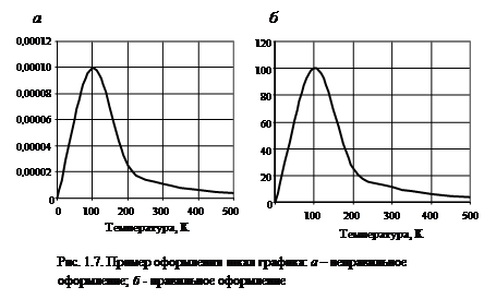 Численные выражения шкал наносят слева от оси ординат (вертикальной оси) и под осью абсцисс (горизонтальной осью). Количество знаков (цифр) в числах шкалы должно быть минимальным для образования кратных или дольных единиц (рис. 1.7). Если шкалы на осях начинаются с нуля, то нуль на их пересечении ставится один раз. Во всех других случаях ставят оба значения.