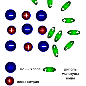 Молекулы воды являются дипольными, т.е. один конец молекулы заряжен отрицательно, другой-положительно. Молекула отрицательным полюсом подходит к иону натрия, положительным-к иону хлора; окружают ионы со всех сторон и вырывают из кристалла, причём, только с его поверхности