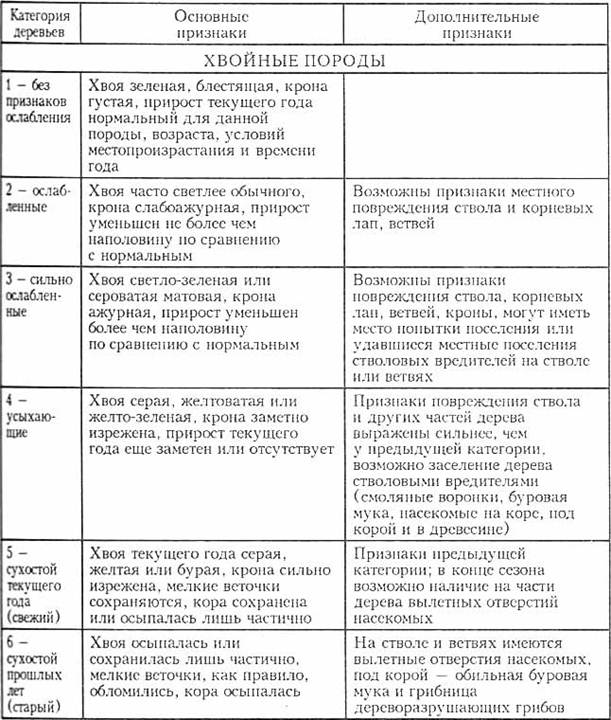 При перечете обязательно указывают заселенность деревьев разных категорий стволовыми вредителями и пораженность болезнями, если признаки поражения четко выражены. В очагах хвое- и листогрызущих вредителей перечет деревьев производится после периода восстановления хвои и листвы, до этого в случае необходимости учитывается лишь степень объедания хвои (листвы) в процентах (1 — без повреждения, 2 — слабое повреждение: менее 25%, среднее: 25—50%, сильное: 50—75%, полное: более 75%).