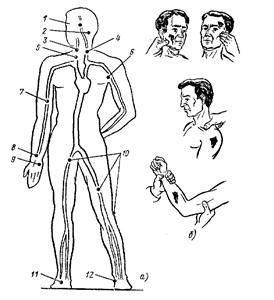 а- главные места прижатия артерий: 1- височной; 2- затылочной; 3, 4-сонной; 5- подключичной; 6- подмышечной; 7- плечевой; 8- лучевой; 9-локтевой; 10- бедренной; 11- передней большеберцовой; 12- задней большеберцовой; б- примеры пальцевого прижатия