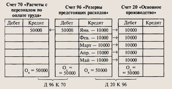 Расходы, на которые заранее создается резерв, постепенно в течение года собираются на кредите счета 96, а использование этих средств показывают по дебету счета 96.