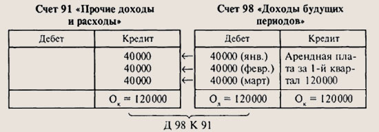 Полученная арендная плата для предприятия является ее доходом, и если она получена за несколько месяцев вперед, то списать ее сразу на счета для учета доходов — это значит резко увеличить выплату налога на прибыль. Для того чтобы этого не произошло, всю сумму арендной платы отражают сначала на кредите счета 98, а затем в течение трех месяцев равными долями ее списывают с дебета счета 98 на счет, предназначенный для учета текущих доходов.