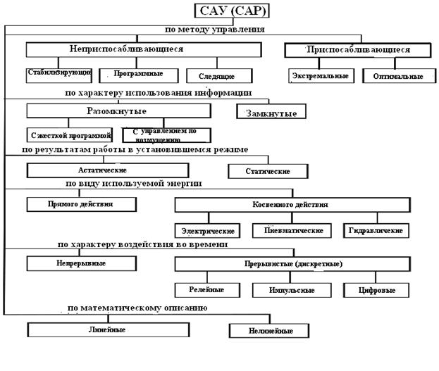 Подгруппа систем, различающихся по методу управления, подразделяется на классы неприспосабливающихся (неадаптивных) и приспосабливающихся (адаптивных) систем, в которых класс неприспосабливающихся систем подразделяется на подклассы стабилизирующих, программных и следящих систем, а класс приспосабливающихся систем подразделяется на классы экстремальных и оптимальных систем.