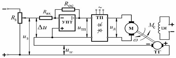 В данной схеме вместо моментной муфты ММ (схема разомкнутого управления, рисунок 17) находится тахогенератор ТГ. С помощью тахогенератора и потенциометра Rз, включенных таким образом, что их выходные напряжения uтг и uз направлены противоположно, так что