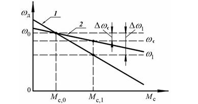 Увеличивая момент сопротивления до некоторого значения Mc,1 > Mc,0, угловая скорость будет уменьшаться на величину Δω1 и станет равной ω1 = ω0 - Δω1, что изображено на рисунке 22 (кривая 1).