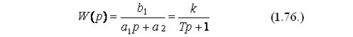 В данном случае Т = a1 /a2 – постоянная времени, характеризующая инерционность звена, k – передаточный коэффициент звена, размерность которого определяется отношением размерности выходного параметра к размерности входного. Постоянная времени – время, за которое величина выходного параметра принимает установившееся значение, т.е. с увеличением Т увеличивается инерционность звена. Звено называется апериодическим или инерционным звеном 1-го порядка, т.к. описывается дифференциальным уравнением первого порядка.