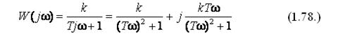 Переходная функция апериодического звена является стабилизирующейся, т.к. при анализе переходной функции можно заметить, что значение величины выходного параметра при постоянном значении величины входного параметра, принимает установившееся значение через определенный промежуток времени. Для получения АФЧХ апериодического звена подставим в выражение (1.76.) jw вместо р, и получим: