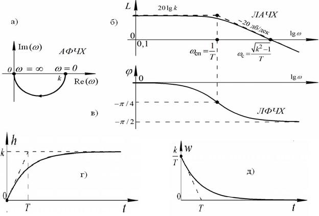 Рис.32. Характеристики апериодического звена: а), б), в) – частотные;