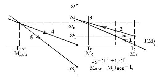 После того, как двигатель разогнался до некоторой скорости ω 1, пусковой резистор шунтируют и двигатель переходит на работу по естественной характеристике (2) Rд =0. При шунтировании пускового резистора происходит скачок тока и момента, который не должен превышать