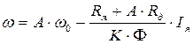 - точка пересечения характеристик соответствует режиму, при котором сопротивление последовательного резистора не будет влиять на ток якоря, то есть когда через последовательный резистор не будет проходить ток. Это возможно только при вращении якоря с угловой скоростью большей скорости идеального холостого хода, когда ЭДС якоря полностью уравновешивает приложенное напряжение сети и внутренние потери в цепи якоря: