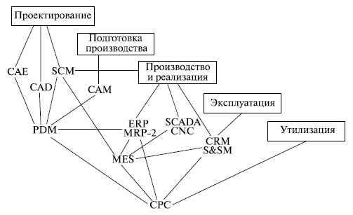 Рис. 4.2. Этапы жизненного цикла промышленных изделий и используемые АС