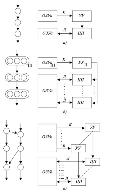 На рис. 6.1а, б, в показаны также соответствующие трем классам ЭВМ алгоритмы организации вычислений. Стрелками в них обозначены потоки команд и данных, кружками — выполняемые операторы. В случае ОКОД ЭВМ используется обычный последовательный алгоритм вычислений.