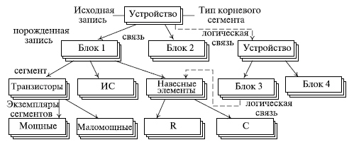 Иерархические модели баз данных исторически возникли одними из первых. В качестве примера рассмотрим иерархическую БД — Information Management Systems (IMS), разработанную в 1967 году. Существуют соответствия терминов, описывающих сетевые модели БД КОДАСИЛ и иерархическую IMS, в частности: тип набора — связь; тип записи — тип сегмента; запись — владелец набора — исходный сегмент; запись — член набора — порожденный сегмент и т. д. (рис. 11.2).