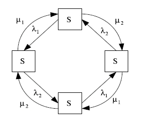 Эти системы основаны на марковском случайном процессе. Физическая система S с течением времени меняет свое состояние (переходит из одного состояния в другое) случайным образом [38]. Тогда в системе S протекает случайный процесс, который называется марковским, если для любого момента времени t0 вероятностные характеристики процесса в "будущем" зависят только от его состояния в данный момент времени t0 и не зависят от того, когда и как система пришла в это состояние. Вероятностные характеристики в "будущем" можно найти: например, вероятность того, что через некоторое время τ система S окажется в состоянии S1 или сохранит состояние S0 и т..