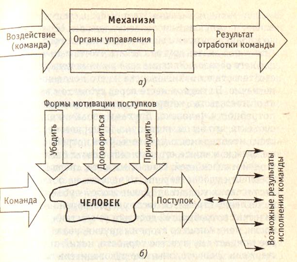 Результаты поступка человека, проявляющиеся в виде реакции на отданное ему распоряжение, неопределенные Все зависит от того, что это за распоряжение (как его исполнение и неисполнение соотносятся с системой предпочтении исполнителя), в каких условиях она отдана, как мотивирован исполнитель лицом, принимающим решения, и т.п. Многочисленные наблюдения показывают[6], что значительную роль играет то, какой метод мотивации (или какую совокупность методов мотивации) выберет ЛПР. Перечисленные концептуальные различия в механизмах получения результата от машины и от человека схематично отражены на рис. 3.4.