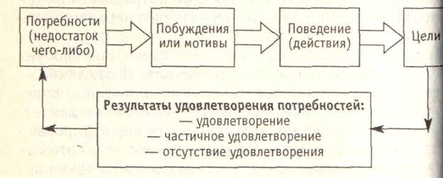 Когда потребность ощущается человеком, она пробуждает в нем состояние устремленности. Побуждение — это ощущение недостатка в чем-либо, имеющее определенную направленность. Оно является поведенческим проявлением потребности и сконцентрировано на достижении цели. Цель в этом смысле — это нечто, что осознается как средство удовлетворения потребности. Когда человек достигает такой цели, его потребность оказывается удовлетворенной, частично удовлетворенной или неудовлетворенной. На рис. 3.5. представлена упрощенная модель мотивации поведения через потребности.