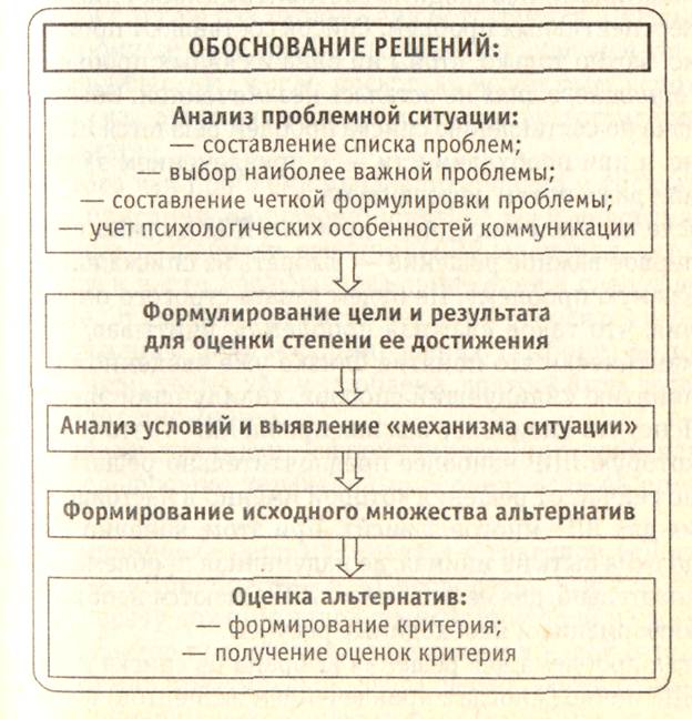 Под обоснованием решений будем понимать подпроцесс проведения всей подготовительной работы для осуществления осознанного выбора ЛПР. Эта работа должна строиться на основе концепций и принципов разработки решений. Концептуально он включает следующие основные задачи: